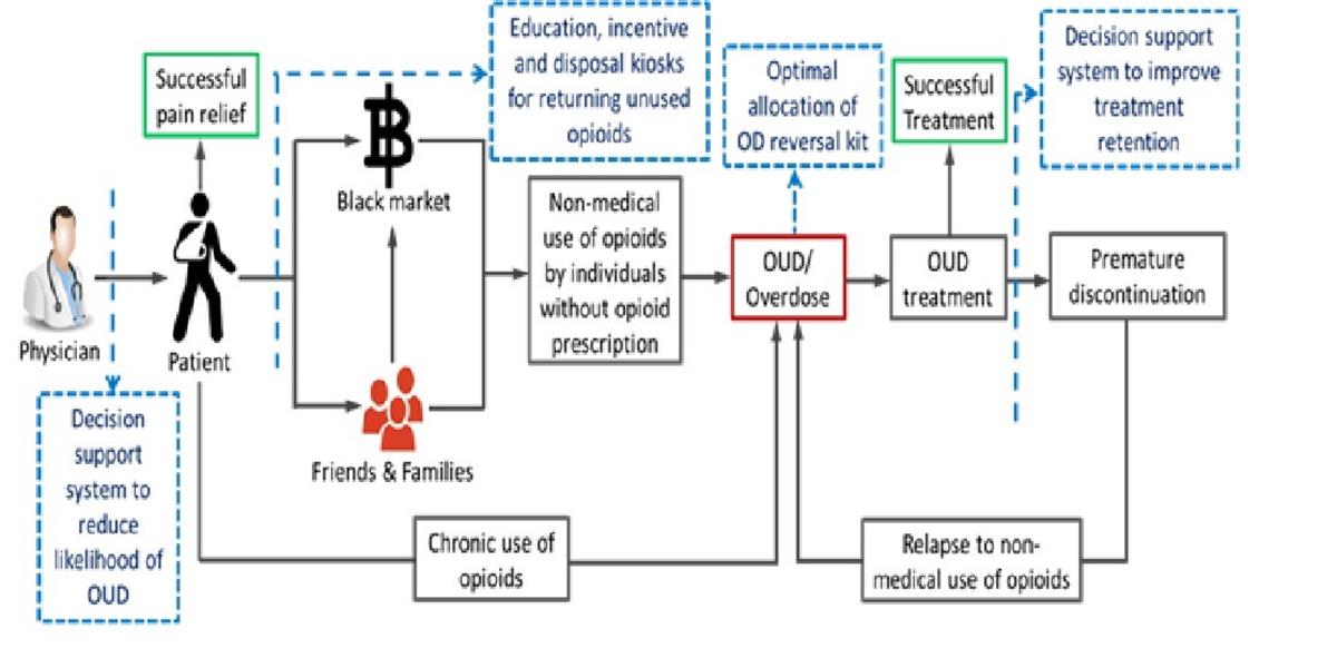 Muhammad Noor E Alam, an associate professor of Industrial Engineering from Northeastern University have been leading multiple research projects pertinent to leveraging Artificial Intelligence (AI) and Operations Research (OR) to address opioid epidemic crisis. This work has led him to invest efforts in the following key areas (e.g., blue dashed box in the Figure) to address this multifaceted critical challenge and how to address by integrating AI and OR: