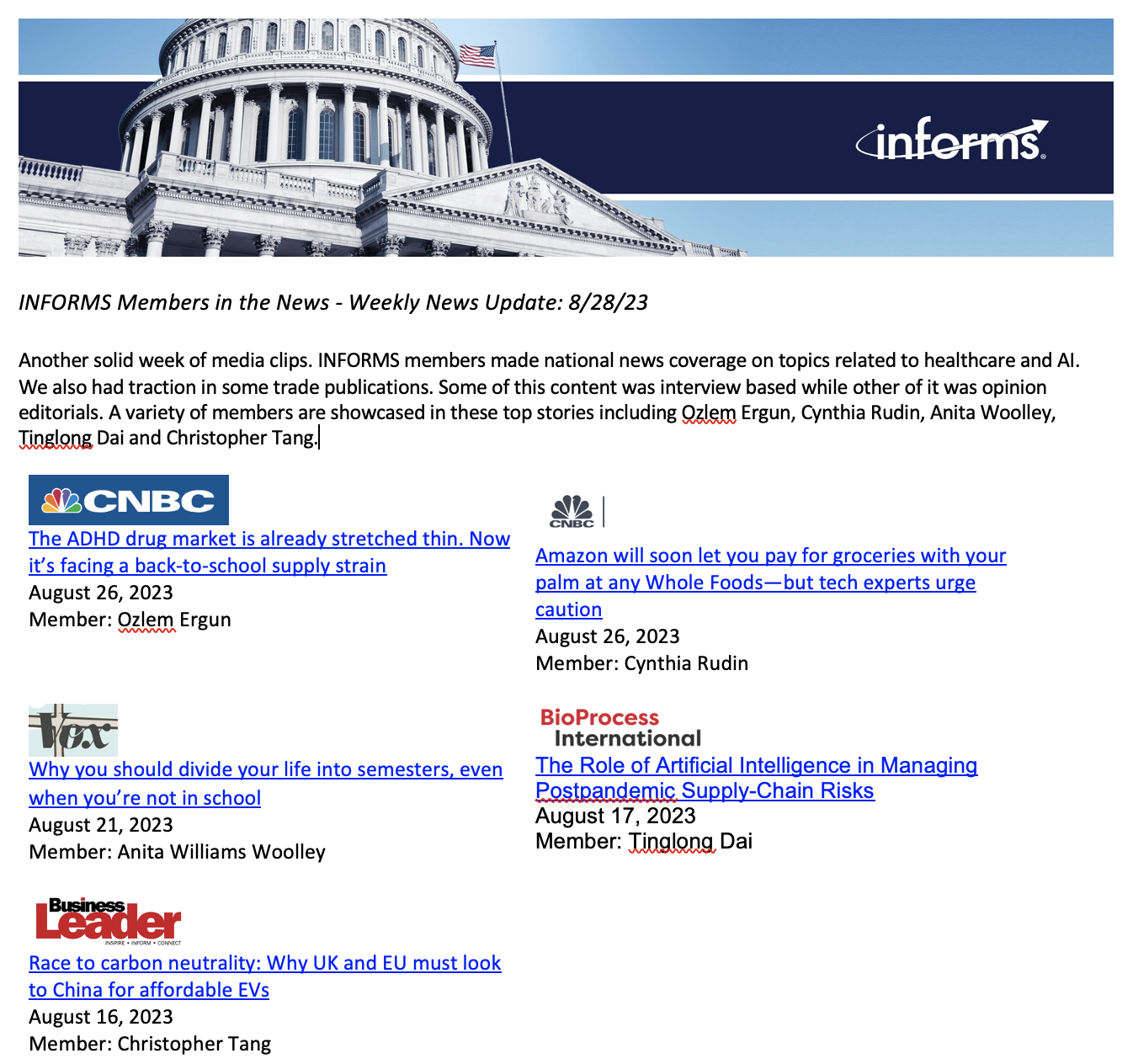 Another solid week of media clips. INFORMS members made national news coverage on topics related to healthcare and AI. We also had traction in some trade publications. Some of this content was interview based while other of it was opinion editorials. A variety of members are showcased in these top stories including Ozlem Ergun, Cynthia Rudin, Anita Woolley, Tinglong Dai and Christopher Tang.