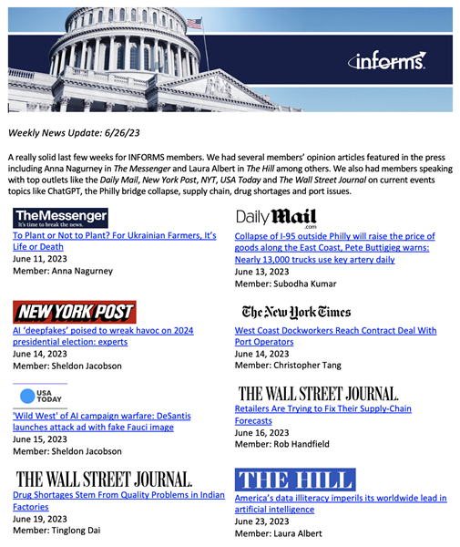 A really solid last few weeks for INFORMS members. We had several members' opinion articles featured in the press including Anna Nagurney in The Messenger and Laura Albert in The Hill among others. We also had members speaking with top outlets like the Daily Mail, New York Post, NYT, USA Today and The Wall Street Journal on current events topics like ChatGPT, the Philly bridge collapse, supply chain, drug shortages and port issues. Check out the full news update by clicking on the attachment.