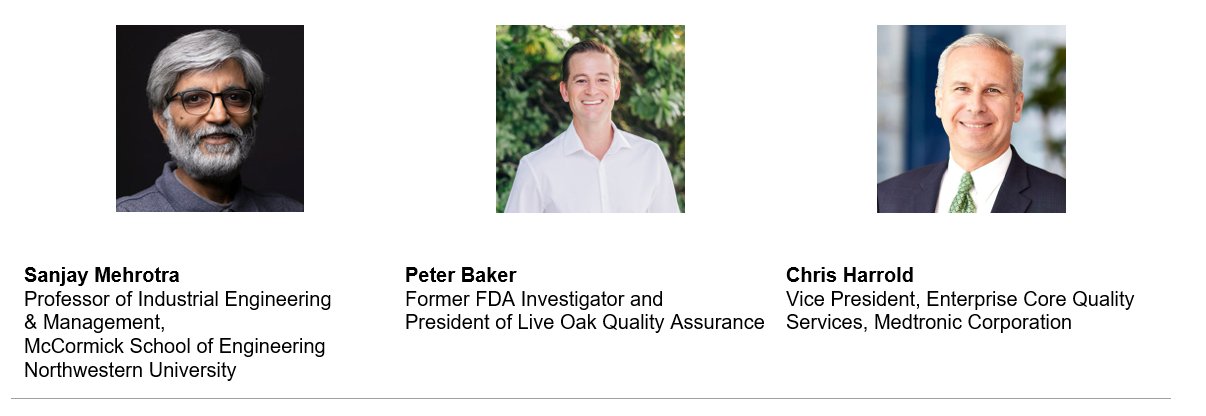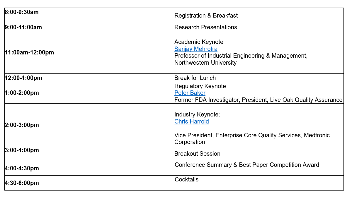 To help present these different perspectives, we will have three keynote presentations. The academic keynote will be given by a leading healthcare scholar, Sanjay Mehrotra from Northwestern University. The industry keynote will be from an experienced Vice-President of Quality at Medtronic Corporation, one of the world's leading life sciences innovation and manufacturing firms. The regulatory keynote will be given by a former FDA investigator who has extensive experience in regulating quality in the pharmaceutical industry.