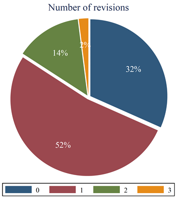 About a third of submitted replication materials could be accepted as is, without further revisions. Most replication packages needed one revision round, and about 16% needed 2 rounds or more until the replication package was approved. Most often, the Code and Data Editor had to ask for better documentation (variable dictionaries, dataset construction instructions, code documentation, etc.).