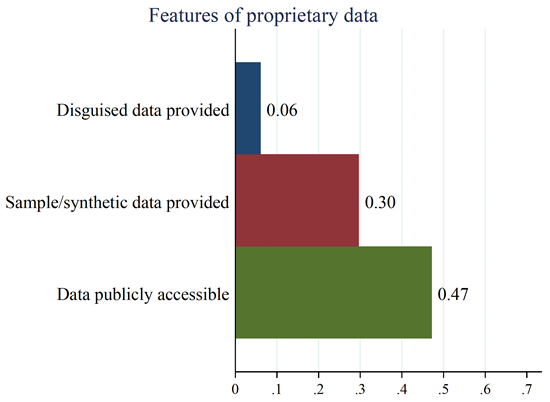 Among all papers that include data, 50% of the eventual replication packages include all data necessary to replicate, while the others rely on proprietary data. Among papers with proprietary data, 47% of the datasets are publicly accessible (e.g., via subscription services like WRDS or Compustat), and 30% of papers provide at least sample or synthetic data. Recently, for papers with proprietary data, the Code and Data Editor more often asked authors to include sample or synthetic data. This yielded more of these (35% in last year vs. 24% before) and was one of the reasons why we could run code tests for more packages (68% last year vs. 60% previously). Over all 3 years, the Code and Data review team could check whether code runs through without errors for 64% of all replication packages. However, they do not check soundness of methods or the actual results, though - this is left to the academic community.