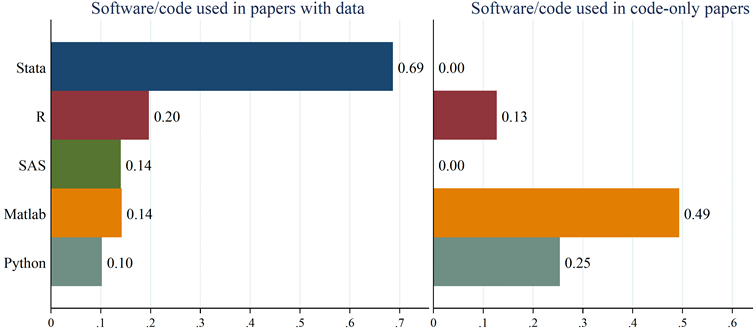 Among papers using datasets, 69% use Stata, and 20% use R. R is more popular than Stata with code-only papers, as is Matlab and Python, with a slight shift towards Python over time. However, across replication packages the reviewers encountered a large variety of statistical and computational tools, including, for example, Fortran, Gams, Gauss, Java, Mathematica, SPSS, SQL, Lingo, etc.