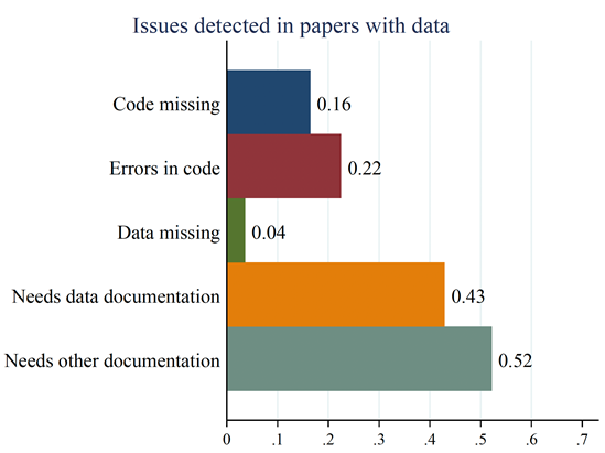 Sometimes parts of the code were missing. Code errors are not uncommon (given 64% of packages where code can be tested, 22% code errors imply that 34% of submitted and tested codes have issues). However, code reliability improved significantly over time. While in the first two years of code and data review, issues in code were detected in 38% of code-tested replication packages, this decreased to 28% in the past year.