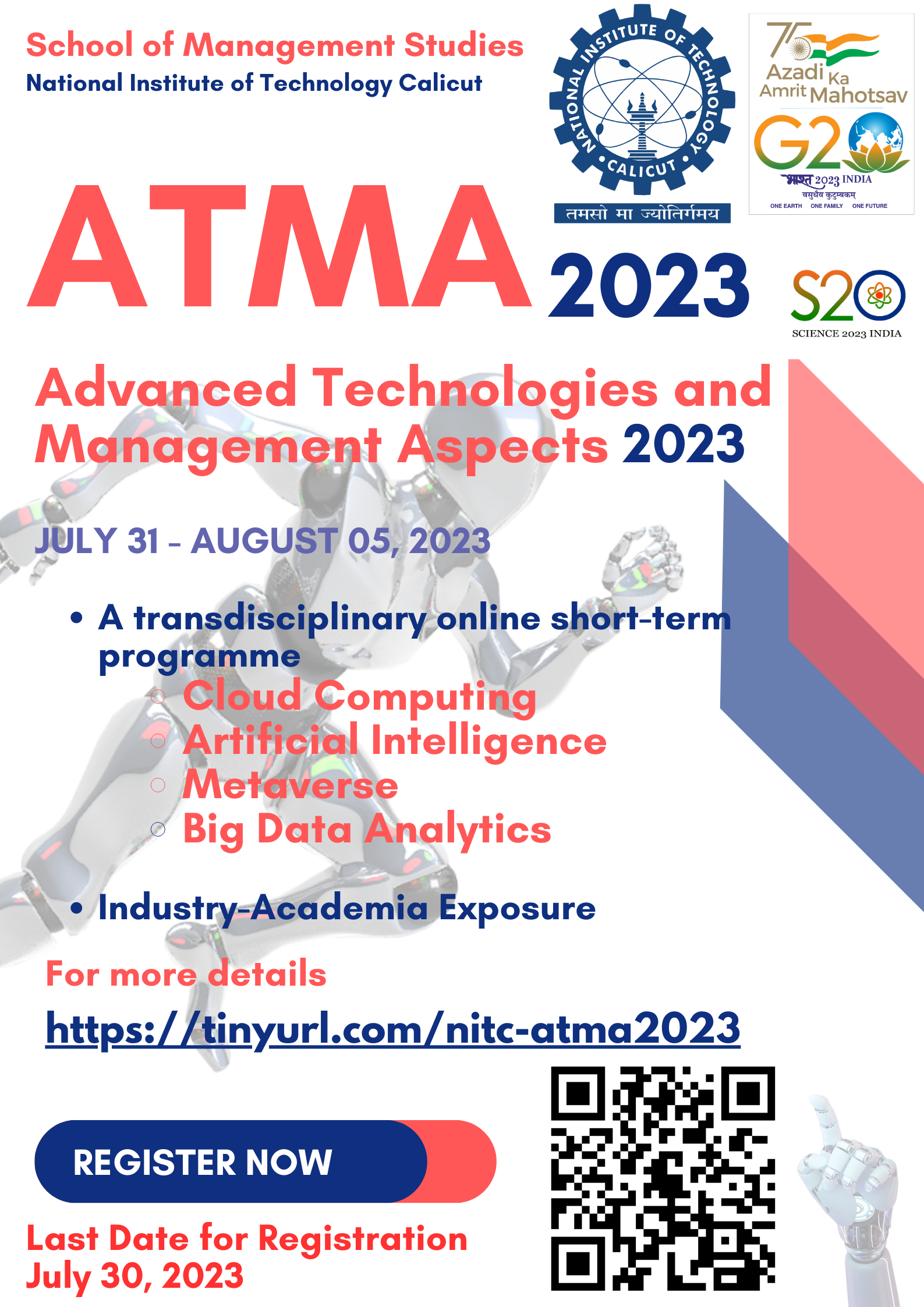 We are glad to inform you that the School of Management (SOMS), NIT Calicut, is organising a Six-day Short-Term Course Workshop on Advanced Technologies & Management Aspects (ATMA 2023) from July 31 – Aug 05, 2023.