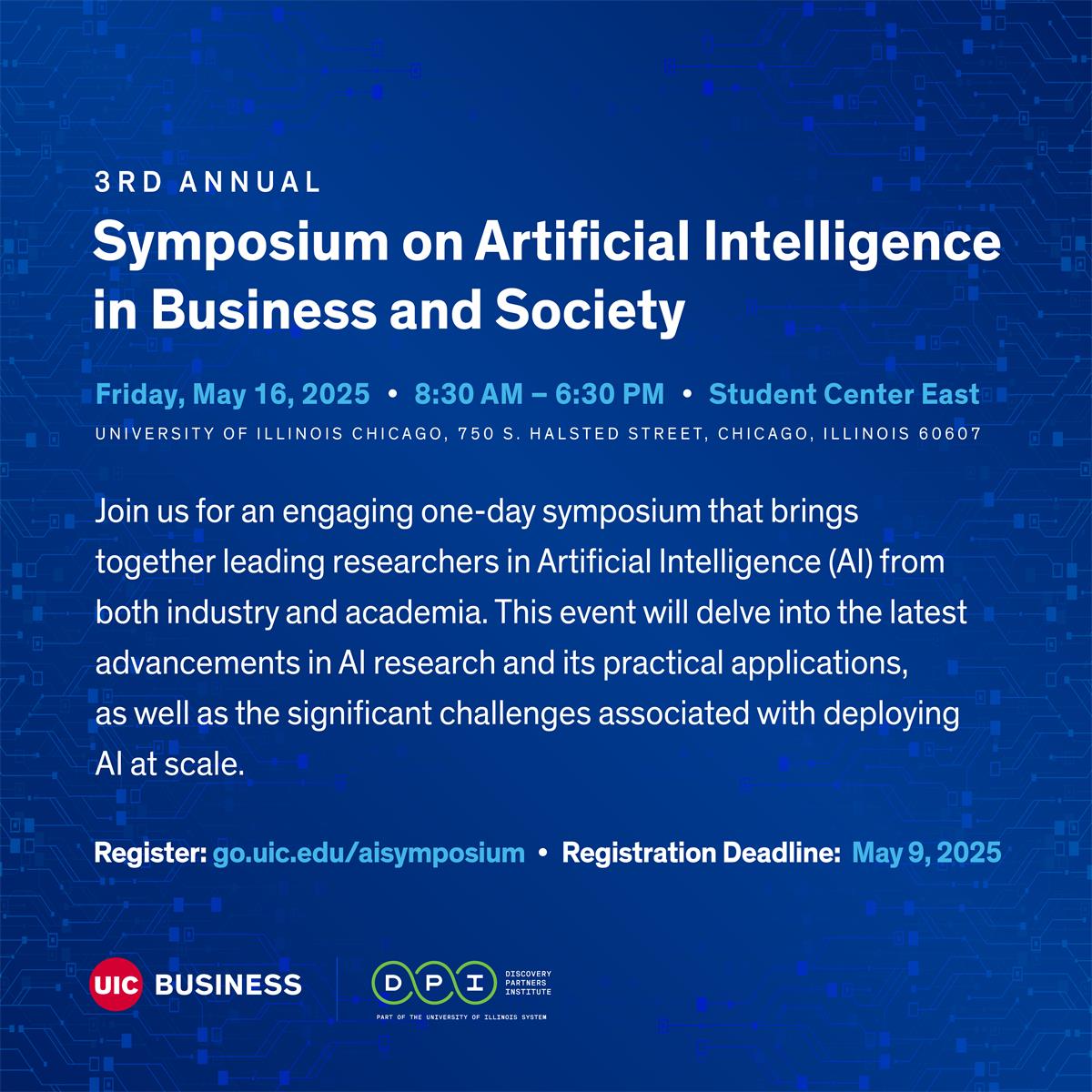 The Department of Information Decision Sciences (IDS) of the University of Illinois Chicago (UIC) is thrilled to invite you to attend the 3rd Annual Symposium on AI in Business and Society on May 16, 2025.