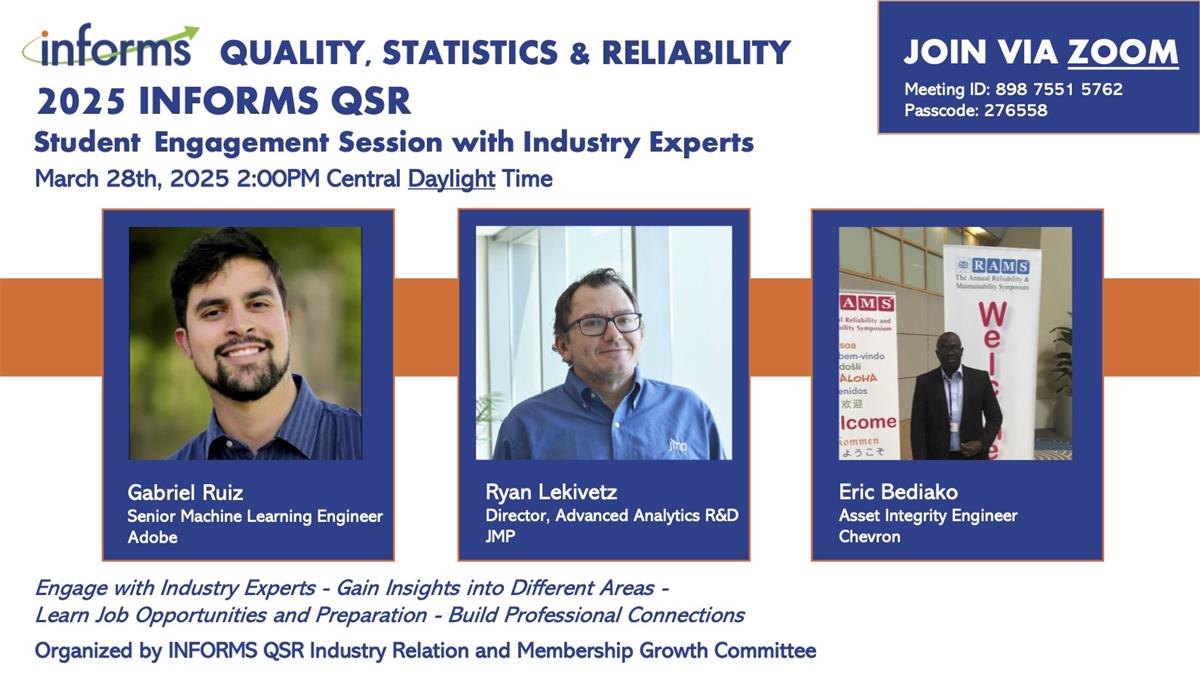 On March 28 at 2 pm CDT, we will have the second edition of the "Student Engagement Session with Industry Experts" organized by the INFORMS Quality Statistics and Reliability (QSR). The goal of the session is for undergraduate and graduate students to interact with experts in the industry in a virtual but cozy environment. This year, we will have Gabriel Ruiz from Adobe, Ryan Lekivetz from JMP, and Eric Bediako, Ph.D from Chevron. Please join us to learn more about their activities, advice to thrive in the industry, tips on how to better prepare for your job applications, and more!